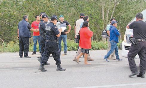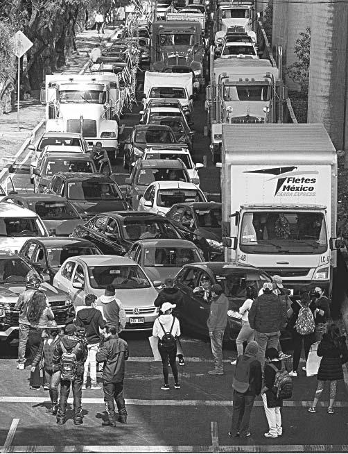 ductores empujando a los manifestantes, quienes intentan mantenerse firmes bloqueando la vialidad.Entre los empujones y jaloneos, algunas personas terminaron en el piso. Durante las tres primeras horas de haber iniciado el bloqueo de la vialidad, se generaron largas filas de vehículos, por lo que elementos de la Policía de Tránsito capitalina arribaron a la zona para desahogar