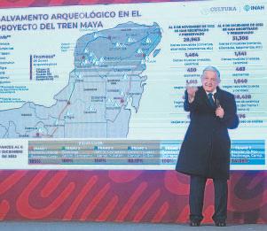 “Ya estamos trabajando prácticamente en los siete tramos del Tren Maya. En los tres primeros ya hemos concluido el trabajo de campo, solo nos queda el de laboratorio y gabinete. Se concluyó en el Tramo 1, Tramo 2, y Tramo 3; en el Tramo 4 tenemos muy avanzadas la tarea de excavación de materiales arqueológicos de manera tal que solo nos queda alrededor del 18% de la excavación que tenemos programada realizar en este tramo. Esperamos esto concluya a más tardar en lo que resta de este año 2022”, indicó