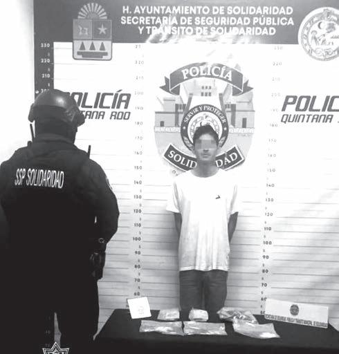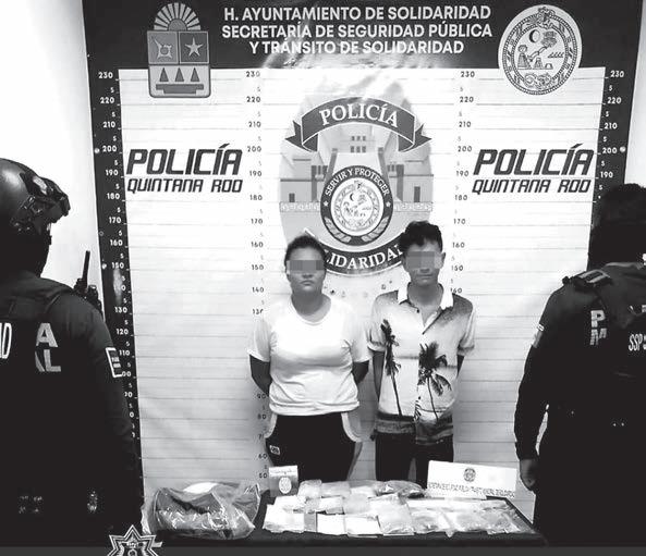 En este sentido, oficiales de la Policía Preventiva que patrulla ban la avenida 110 con calle 16, aseguraron a Pedro “N”, de 28 años de edad, oriundo de Quinta na Roo y a Estefanía “N”, de 28 años de edad, originaria de Cam peche, quienes tenían en posesión de ocho cartuchos útiles, 244 en voltorios con pastillas de diver sos colores, siete envoltorios con posible marihuana, uno más con hongos, otro con lo que parecía cocaína, uno con posible uno más con cristal