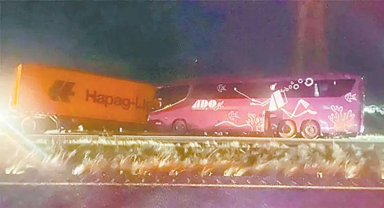 VERACRUZ, Ver.- Un autobús de pasajeros de la línea comercial ADO se impactó ayer por la madrugada contra la parte posterior de un tráiler en el libramiento de Perote, Veracruz, lo que dejó un saldo de ocho personas que perdieron la vida y 27 más que resultaron lesionadas, de acuerdo con la Fiscalía General del Estado (FGE), instancia que ya investiga las causas del percance.