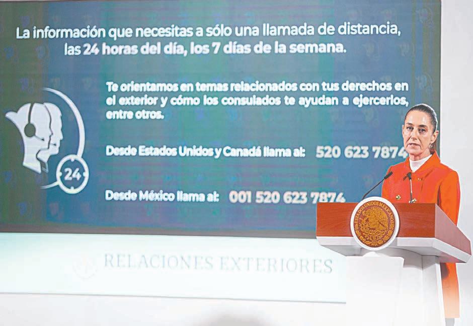 CIUDAD DE MÉXICO.- El Gobierno de México lanzará en enero una aplicación denominada Botón de Alerta para que los mexicanos en Estados Unidos adviertan a los consulados de una detención o deportación, ante las promesas del presidente electo estadounidense, Donald Trump. Durante su conferencia matutina de ayer, la presidenta Claudia Sheinbaum presentó el Programa de Apoyo para las y los Mexicanos en Estados Unidos, que prevé -además del Botón de Alerta- el fortalecimiento de los 53 consulados, la puesta en marcha de un Centro de Información y Asistencia a Personas Mexicanas (CIAM) para brindar apoyo legal vía telefónica y la implementación de una Ventanilla Única de trámites consulares. Sheinbaum acotó que se busca que las y los migrantes sepan que tienen derechos, “que no se puede deportar a una persona tomándola, llevándola a la frontera, sino que tiene que seguirse una serie de procedimientos legales que son procedimientos en Estados Unidos”. Puntualizó que, en caso de alguna detención, puedan llamar al Consulado para que reciban todo el apoyo jurídico y legal.