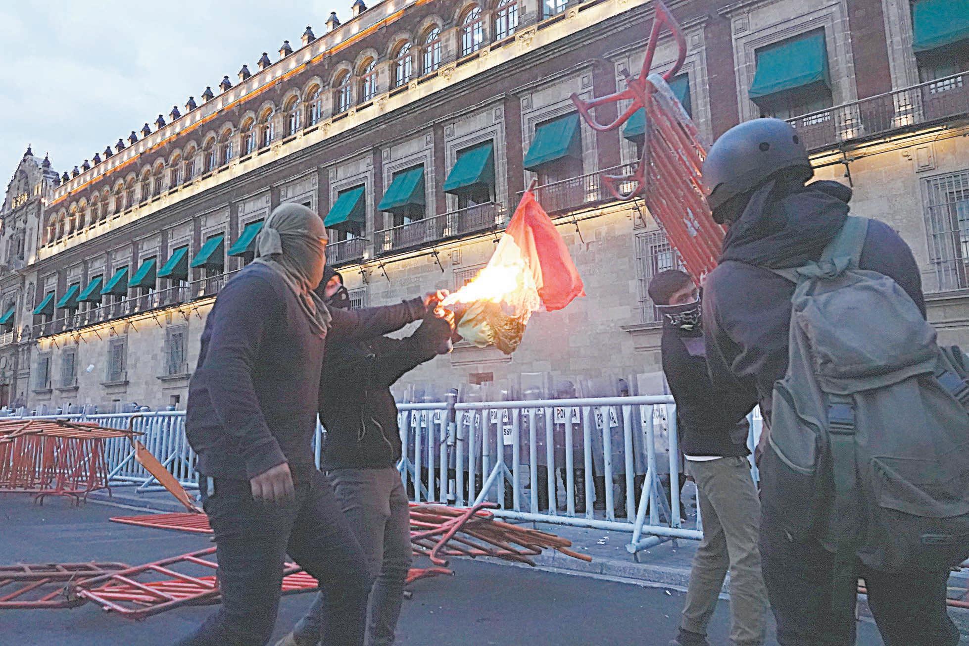 Los manifestantes mancharon la fachada y realizaron pintas a su paso sobre las calles 5 de Mayo y Paseo de la Reforma, pese al cerco de seguridad instalado por policías de la Secretaría de Seguridad Ciudadana (SSC) frente al Palacio Nacional.