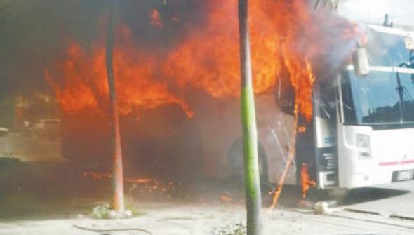 La mañana de ayer, un autobús de pasajeros fue consumido por el fuego. Las causas del siniestro se desconocen; de acuerdo con testigos, el fuego fue provocado por una persona que amenazó al conductor, y aunque esta versión no fue confirmada por las autoridades, se investiga un posible atentado.