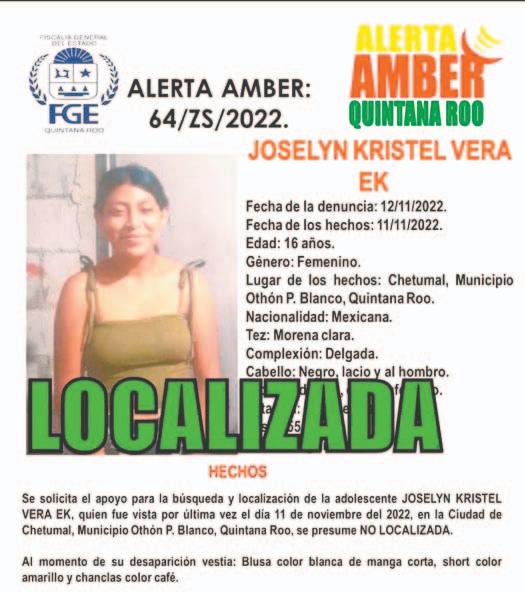 CHETUMAL.- La menor de edad que se encontraba desaparecida y por la cual se activó la Alerta AMBER el fin de semana pasado, fue localizada por elementos de la Policía Ministerial y entregada a sus familiares.
