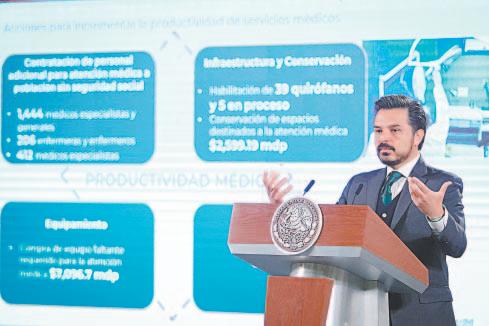 mil 599 millones de pesos, con 39 quirófanos rehabilitados y cinco en proceso; en equipamiento, se ha comprado equipo médico por un total de 7 mil 96 millones de pesos.