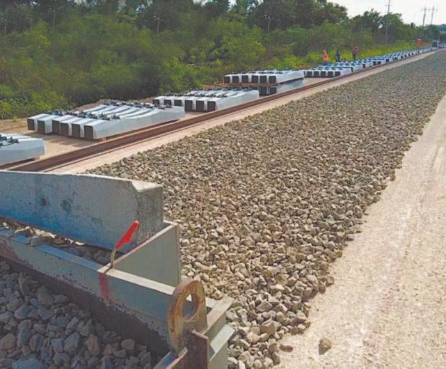 En el tramo 3, de Calkiní a Izamal, cerca de Maxcanú, Estado de Yucatán, sigue la distribución de riel y el acomodo de balasto; en el sitio ya se encuentran los durmientes para el armado de vía. Aquí también avanza un paso vehicular que dará seguridad al cruce del tren con vehículos y a la conexión con el poblado.