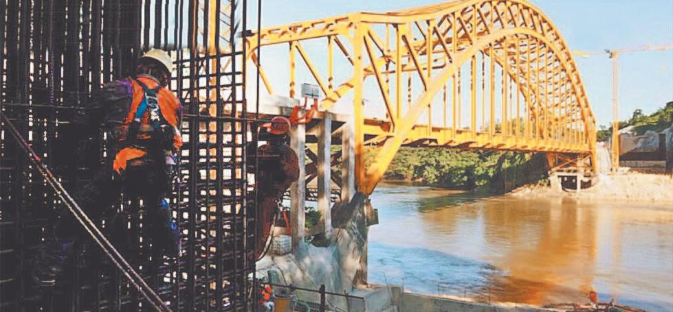 En el tramo 1, que va de Palenque a Escárcega, avanza la construcción del puente de Boca del Cerro, en Tenosique, Tabasco, con el armado de muros y la colocación del refuerzo.