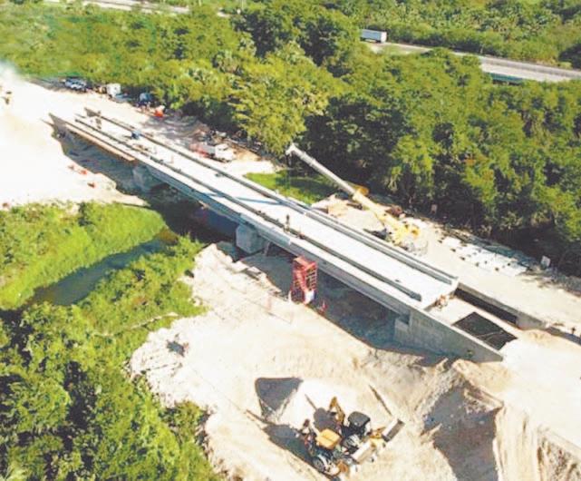 Igualmente, en el tramo 2, de Escárcega a Calkiní, continúa el levantamiento del Viaducto de Santiago, en Hampolol, Campeche, donde ya se encuentran colados los pilotes.