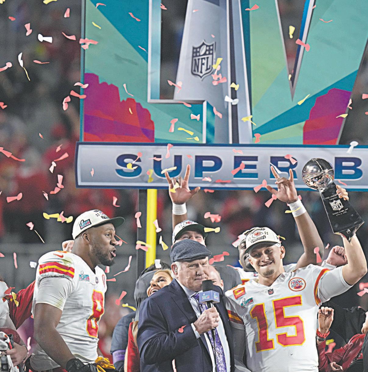 Tras un partido agónico, con un gol de campo a ocho segundos del final, los Chiefs de Kansas City conquistaron su tercer campeonato de la NFL en su historia / Derrotaron 38-35 a los Eagles de Filadelfia, con el quarterback lesionado, Patrick Mahomes, que fue capaz de liderar la remontada en la segunda mitad / Los Jefes sellaron el triunfo consiguiendo la tercera mayor cantidad de puntos en un Super Bowl