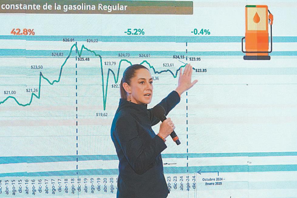 reales el precio del combustible. Asimismo, destacó que en los tres primeros meses del Gobierno de la presidenta Claudia Sheinbaum se ha presentado una reducción del 0.4%, comenzando en octubre en 23.95 pesos y, al corte del 2 de enero se registra en 23.85 pesos, con lo que el precio de la gasolina en México está por debajo del registrado en países como Sudáfrica, España, Reino Unido, Alemania, Francia, Italia y Suiza.