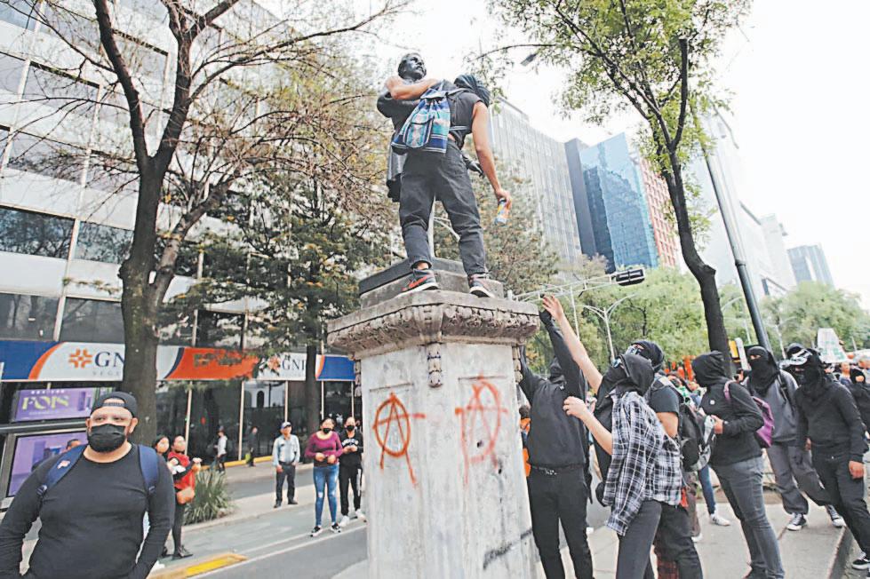 Por un lado, un grupo de jóvenes con vestimenta negra y cubiertos del rostro, realizó pintas a paredes, pisos y algunas estatuas, así como rompió algunos vidrios, para exigir que se garantice el derecho a la movilidad en la capital de manera segura y sin militarizar los espacios públicos.