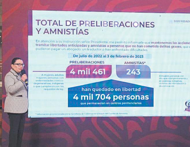 CIUDAD DE MÉXICO.- La secretaria de Seguridad y Protección Ciudadana, Rosa Icela Rodríguez Velázquez, indicó ayer que, de julio de 2022 al 3 de febrero de este año, 4 mil 704 mujeres, adultos mayores, indígenas, enfermos terminales y víctimas de tortura fueron preliberados o recibieron amnistía.