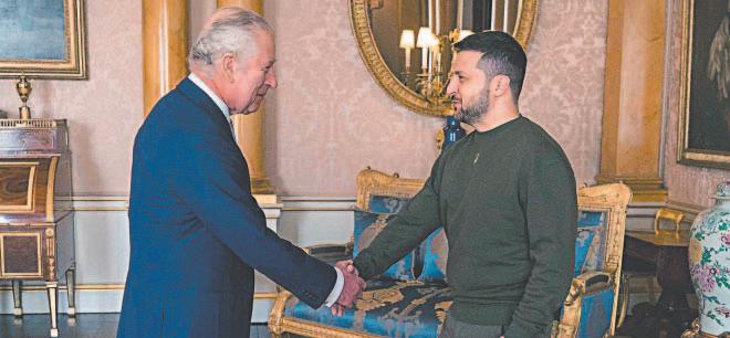VOLODIMIR Zelenski (d) saludó al Rey Carlos III (i) y al Primer Ministro Rishi Sunak; en el Palacio de Westminster expuso: “Tenemos libertad, dennos alas para protegerla”.- (AFP)