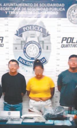 de edad, originario de Yucatán; Samuel “N”, de 21 años de edad, procedente de Tabasco y Josefina “N”, de 34 años, originaria de Guerrero, en posesión de 14 envoltorios con marihuana, 31 con lo que parecía piedra y un arma de plástico, tras ser sorprendidos intercam-