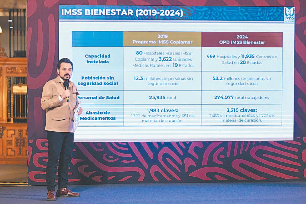 En la conferencia mañanera bledo presentó un comparativo entre el modelo IMSS Coplamar en 2019 e IMSS Bienestar en 2024, el cual ya está presente en comunidades de Baja California, Baja California Sur, Campeche, Chiapas, Ciudad de México, Colima, Estado de México, Guerrero, Hidalgo, Michoacán, Morelos, Nayarit, Oaxaca, Puebla, Quintana Roo, San Luis Potosí, Sinaloa, Sonora, Tabasco, Tamaulipas, Tlaxcala, Veracruz y Zacatecas.