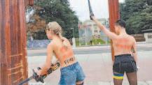 Al menos tres activistas feministas fueron detenidas ayer después de vandalizar un monumento en el exterior del complejo de Naciones Unidas en Ginebra para protestar contra la guerra de Rusia en Ucrania y lo que consideran el fracaso de la institución para detener el conflicto. Dos mujeres con el pecho descubierto que pertenecen al grupo FEMEN, conocido por sus protestas provocativas, utilizaron una motosierra para cortar la escultura de madera conocida como la Silla Rota Una mujer con flores blancas en el cabello hizo varios cortes en una pata de la escultura, una silla gigante de 12 metros de alto con una pata rota. La obra simboliza la mutilación causada por las minas terrestres y es un llamado a prohibir el uso de estas devastadoras armas, que también se han empleado en la guerra en Ucrania. Las dos mujeres llevaban bandas con los colores azul y amarillo de la bandera ucraniana en las piernas. Llevaban frases contra las minas y Rusia pintadas en su pecho y espaldas desnudas con temperaturas próximas a valores negativos, y gritaron repetidamente improperios contra la ONU y Rusia. Se negaron a hablar con reporteros tras la protesta. Al menos tres mujeres -incluyendo a una compañera de las dos activistas- fueron detenidas más tarde por la policía en tres vehículos. (Agencias)