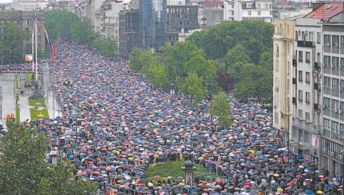 Frente a la sede de la televisora RTS sonaron silbatos y abucheos. La gente dice que, según la ley, la TV estatal debe ser imparcial, pero que ha sido abiertamente favorable al Gobierno. Las protestas constituyen el inicio de la mayor rebelión contra el régimen de Vucic en sus 10 años en el poder.