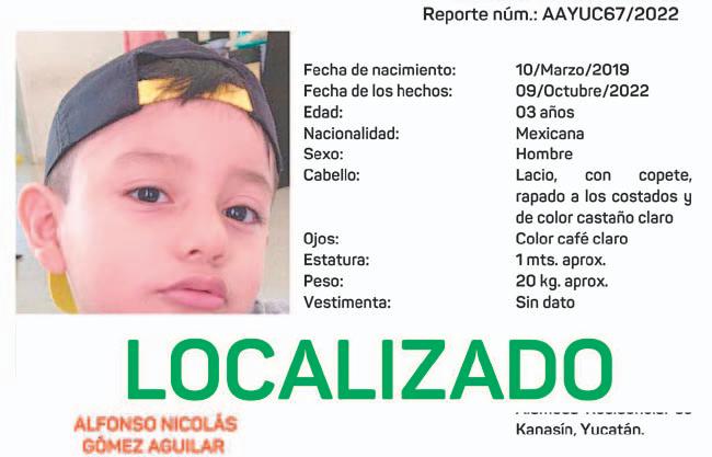 También la Unidad de Investigación y Litigación Especializada en Justicia para la Mujer y la Coordinación Estatal del Progra-ma Alerta Ámber Yucatán dieron a conocer la desactivación de la ficha de búsqueda de Alfonso Nicolás Gómez Aguilar, de tres años de edad, emitida el pasado 12 de octubre, porque ya fue localizado.