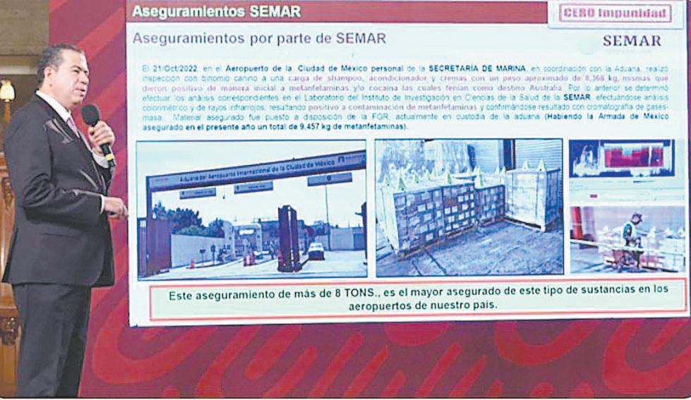 el aseguramiento de más de ocho toneladas de esa droga, es el mayor que se ha logrado de ese tipo de sustancias ilícitas en los aeropuertos mexicanos, donde suman 9 mil 457 kilogramos de metanfetaminas aseguradas en lo que va de este 2022.
