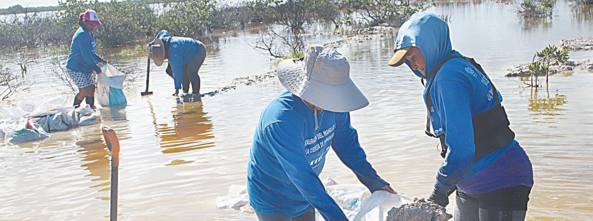 Mientras que las senescentes realizan la costura del material a utilizar, las más jóvenes recorren el humedal de Progreso para atender los canales ya realizados, al mismo tiempo que llenan sacos con lodo, mismo que servirá para la plantación del mangle.
