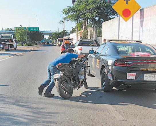 Con varios golpes y raspones acabó un motociclista tras derrapar y salirse de la carpeta asfáltica en el kilómetro 18 del Periférico, donde lo colisionó un automovilista que no guardo su distancia reglamentaria.