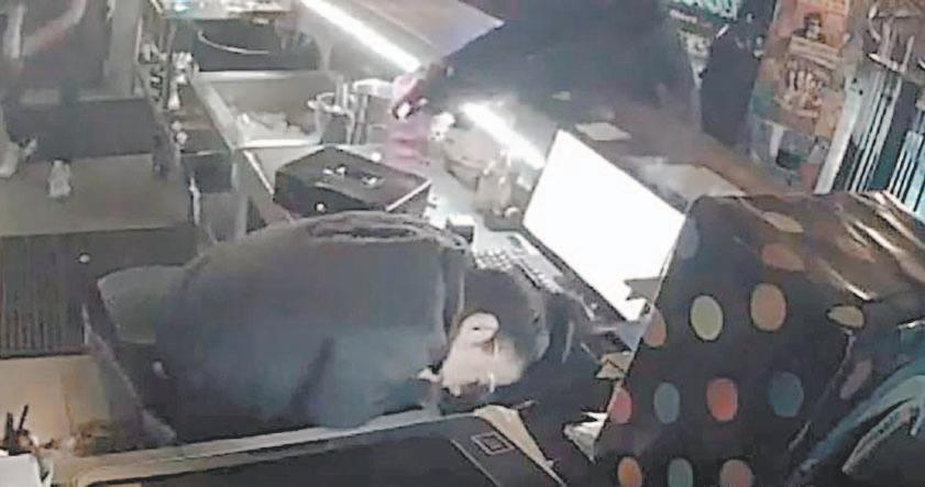 Acto siguiente, uno de los criminales tiró balazos contra dos empleadas, pero no se ve que le diera a alguna por lo que saltó la barra, se agachó y disparó contra la mujer.