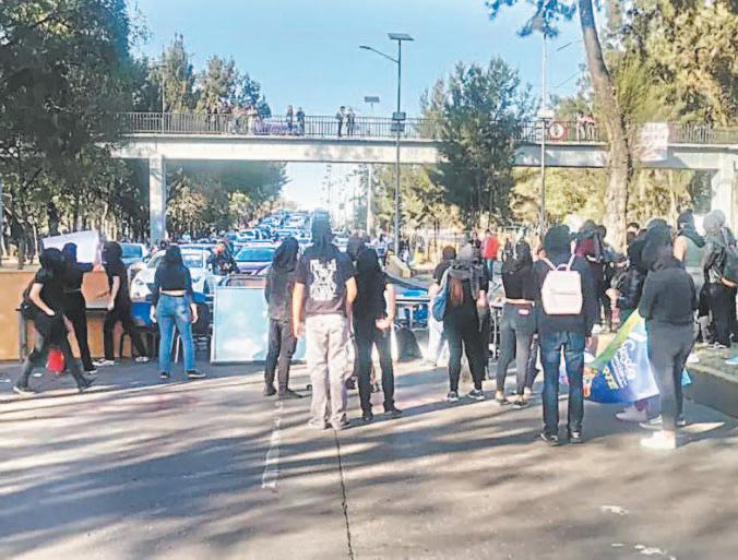 Cerca de 30 estudiantes vestidos de negro y encapuchados colocaron barricadas para cerrar ambos sentidos de los carriles centrales de Río Churubusco a la altura de la avenida de las Torres, colonia Carlos Zapata Vela, en la alcaldía Iztacalco