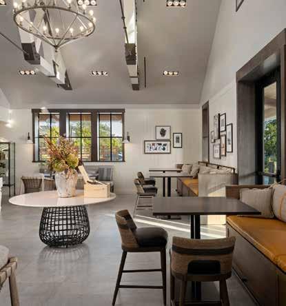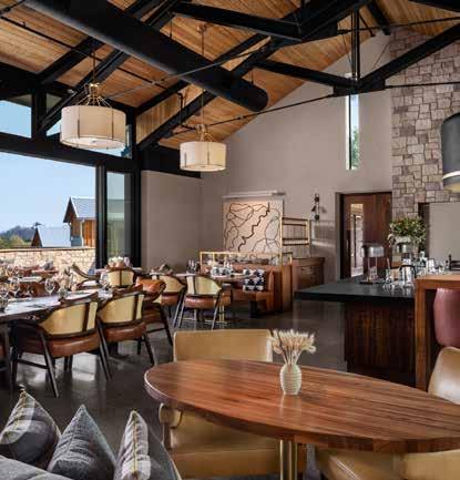 There are just 85 rooms and suites, grouped in two-story, free-standing cottages and 20 residences, all in an iron grey board and batten treatment. Landscaped paths with native grasses, sage bushes, and olive trees blend perfectly with the natural surroundings throughout the 23-acre site. Every accommodation offers outdoor living with a patio or terrace, furnished to enjoy al fresco room service or a sip of some wine while watching the setting sun. We were pleasantly surprised at the roominess when we walked into our Palisades room on the second floor. If this was the size of a room, I could only imagine what a suite must be. As a bonus, windows on three sides bring energy to the space with abundant natural light. The amenities were impressive as well: gas fireplace, 20-bottle temperature-controlled wine refrigerator, private bar station with Nespresso machine, beverages, and libations, curated stemware, generous shower/bath combo area with soaking tub, rain and hand-held shower, dual vanities, desk, chase lounge, window seat with table and chair, and automated blinds and integrated lighting. But it’s the design elements that punctuate the premises: the bead board, the vaulted ceiling, the substan-