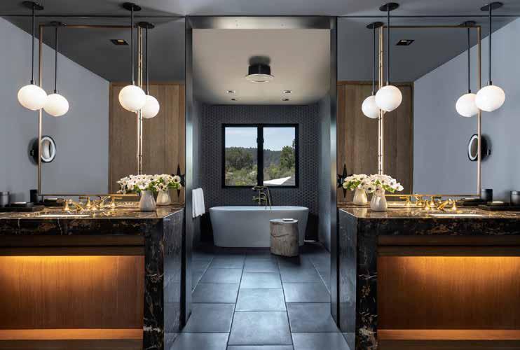 tial pocket doors, interesting light fixtures, the custom-made live edge headboard above the consistently exceptional Four Seasons beds and linens, and the little touches like the leather bridle that decorates the mantle, the beautiful throw across the couch, or the pieces of driftwood and books on the shelf. The brightness of the living area transitions into the moodiness of the charcoal bathroom; octagon tiles surround the glassedin shower area, accented with the warm wood of a tray that lays across the stand-alone tub and the petrified wood side table where the Le Labo products rest, the natural grey stone countertop with the open shelves below hold baskets of thirsty towels, the brass on all the fixtures and accents around the mirrors offset the tonality of the space. The design vision, executed beautifully throughout the resort by Hirsch Bedner Associates, offers a regenerating and private atmosphere, a home away from home sentiment. “Love Opens Doors” is imprinted on the key card; it’s clear that much love was put into this resort.
