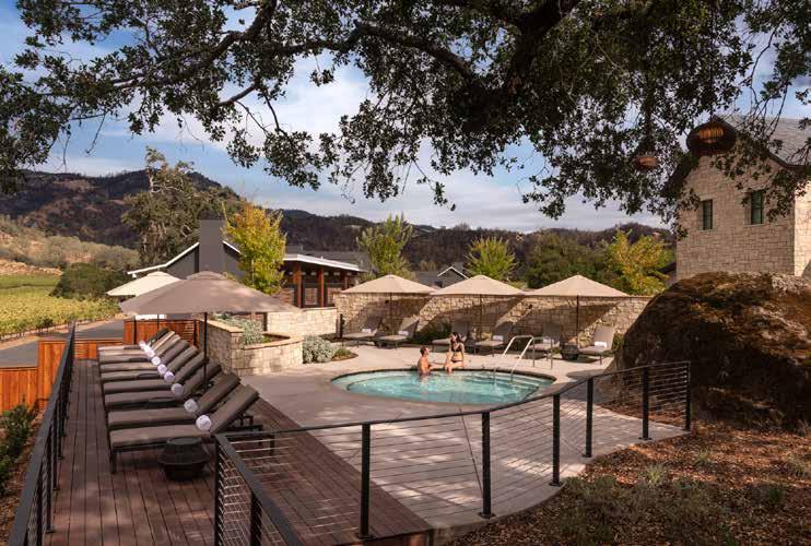 ing its small-town feel. In other words, if you aren’t explicitly looking for it, you’ll admire the property’s splendor but pass by the barely marked entrance at 400 Silverado Trail. The aesthetic blends seamlessly into the landscape and valley vibe but also stands out with its modern farmhouse-chic design. Neutral-colored materials of stone, wood, and metal throughout pay tribute to the culture of Napa; barn silhouettes strike a pose as the stand-out architectural features. But the highlight of this special spot is that it sits smack dab in the middle of a vineyard. That’s right; this property is Napa Valley’s first and only resort in a working winery. You have lovely views of the onsite vineyard from every vantage point on the property and every suite.