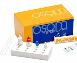 The OSOM® Ultra Strep A test is a color immunochromatographic assay intended for the qualitative detection of Group A Streptococcus antigen directly from throat swab specimens. Shown to be not statistically different than single swab culture. Sensitivity 95.7% and 100% Specificity. Includes two additional test sticks for External QC. CLIA Waived.