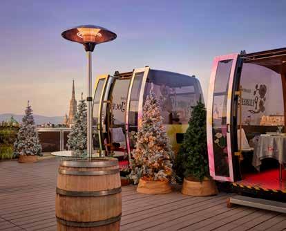 Along with a food menu of both sweet and savory items to complement the signature cocktails, wine offerings, and the special champagne campaign with Perrier-Jouët, the terrace team brings creativity to new heights, literally. A few examples: In June, a Formula 1 race car was hoisted by crane to the 8thfloor bar in celebration of the Austrian Grand Prix. To celebrate Vienna’s famous Christmas Market, the popular outdoor lounge doesn’t just serve cocktails; it also hoists several gondolas up to the transformed Winter terrace. Cozy compartments for couples to gather, enjoy views of the snow-covered city below when the skyline shines brightest, and savor mulled wine, raclette, Buchteln, and more within the heated ski gondolas. (Note to self: Return to Vienna for Christmas markets.)