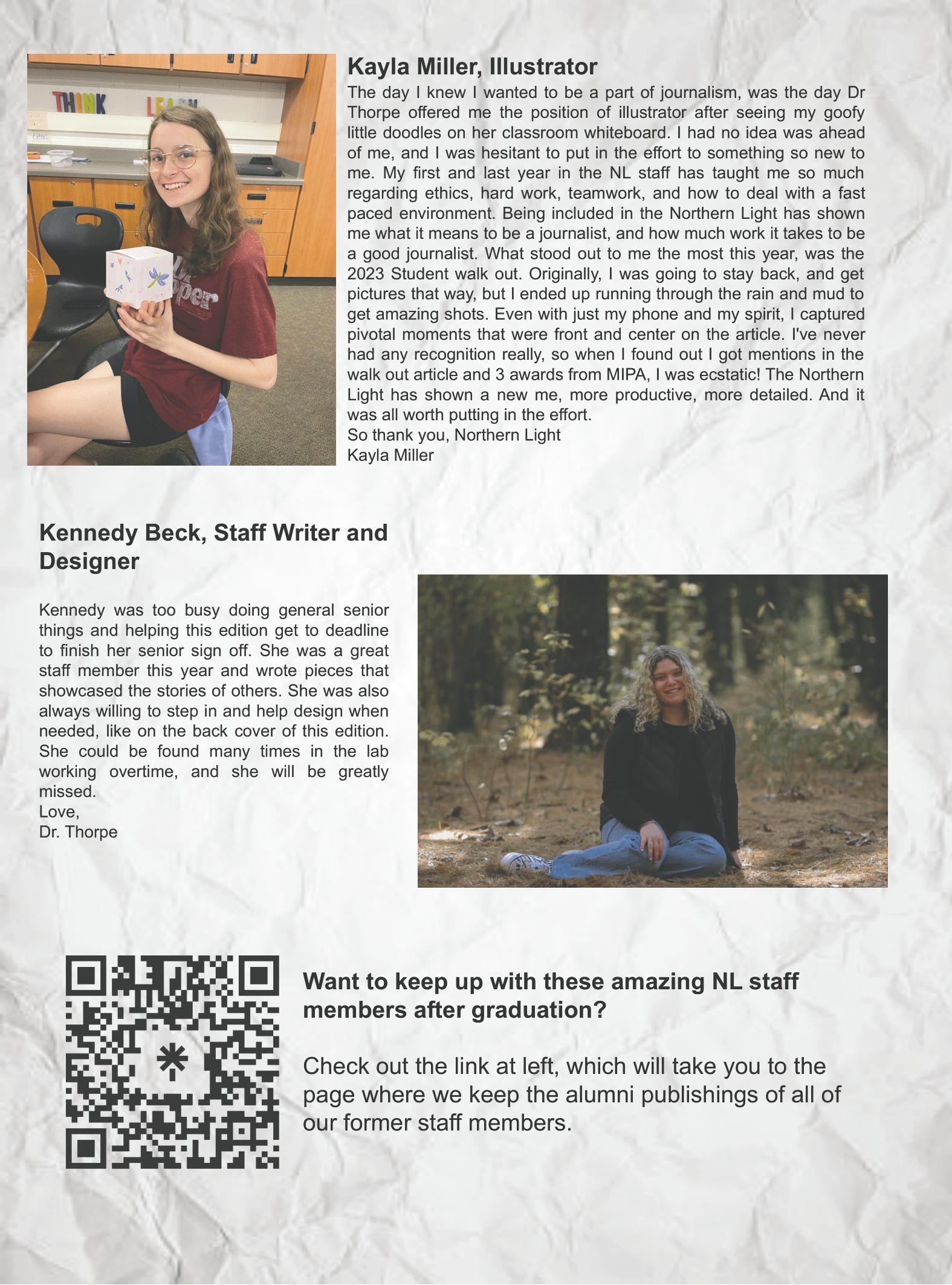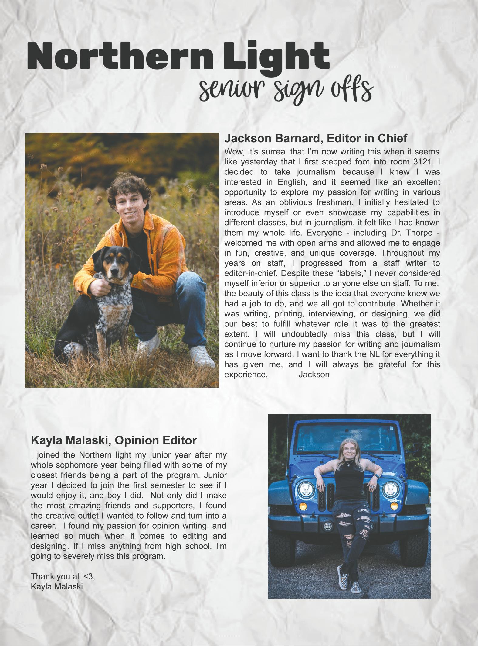 A er a 12-week online break from print, the NL sta is thrilled to be back in print to bring you the nal edition of the 20222023 school year: the annual senior edition, which is our gi to our seniors. In particular, we on the NL celebrate co-editor in chief Jackson Barnard, opinion editor Kayla Malaski, illustrator Kayla Miller, and sta writer and designer Kennedy Beck: Kayla Malaski for all the fun conversations and always picking me up when I am down, Jackson, thank you for helping me lead the NL and teaching me many new words, Kayla, I will miss you and all the random stories I hear while we are all working in the classroom, and Kennedy, I will miss the random conversations about which makeup brands we think are better. To all of the other seniors, best wishes for your bright future, and we hope you enjoy this parting gi .