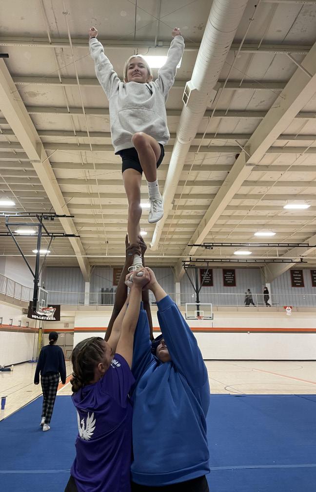 3. The varsity cheer team reps their one leg stunts for competitions. Flying this stunt is Ainsley Kelm. Photo by Abby Hostler.