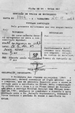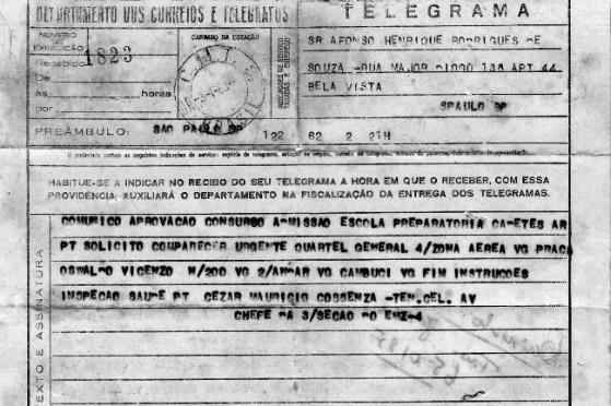 Ficha de Inscrição para ingresso à EPCAR. Telegrama com a aprovação no concurso. Concentração inicial.