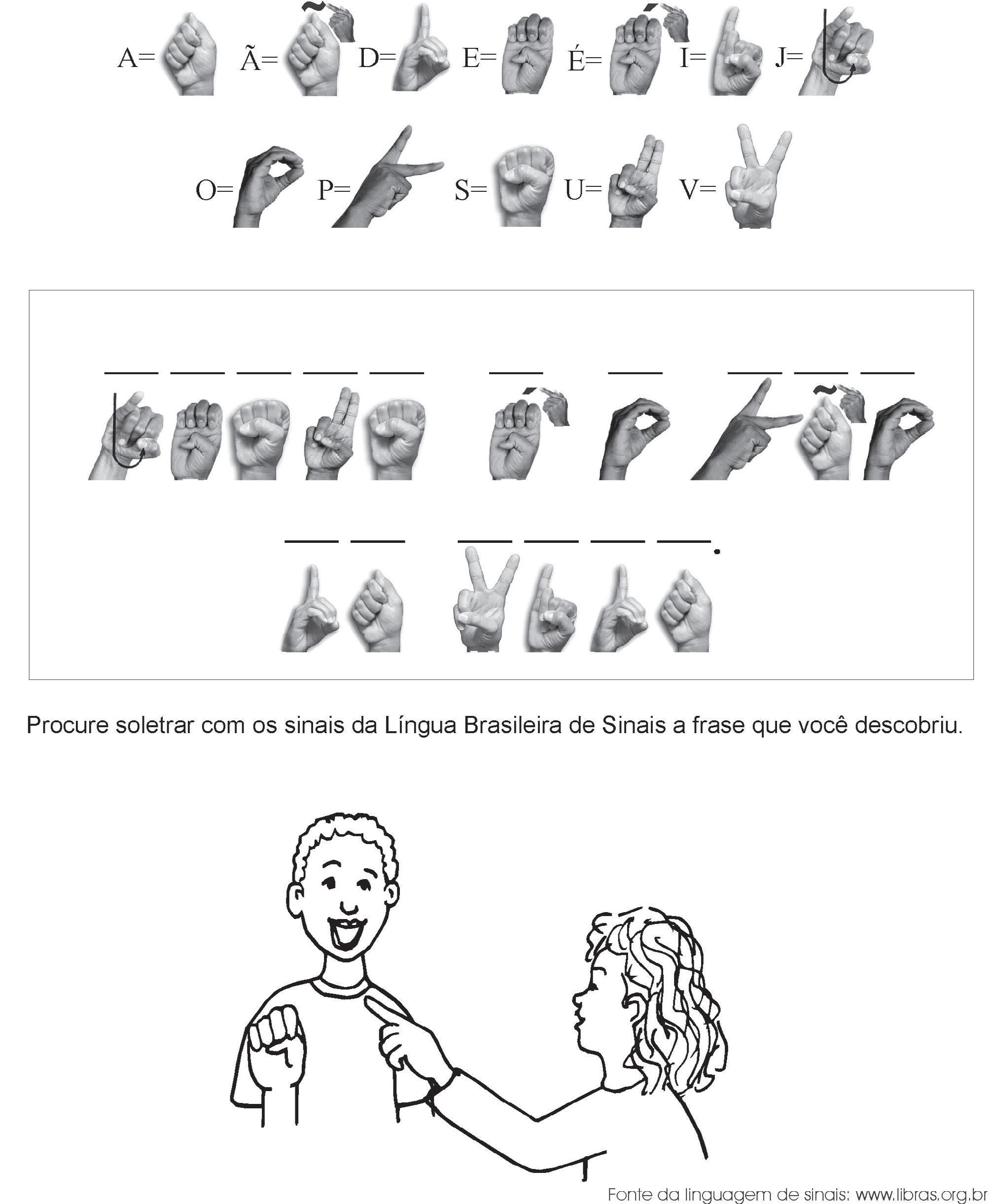 Escreva a letra no traço, conforme o alfabeto manual que pertence à Língua Brasileira de Sinais (LIBRAS), e descubra uma mensagem muito importante.