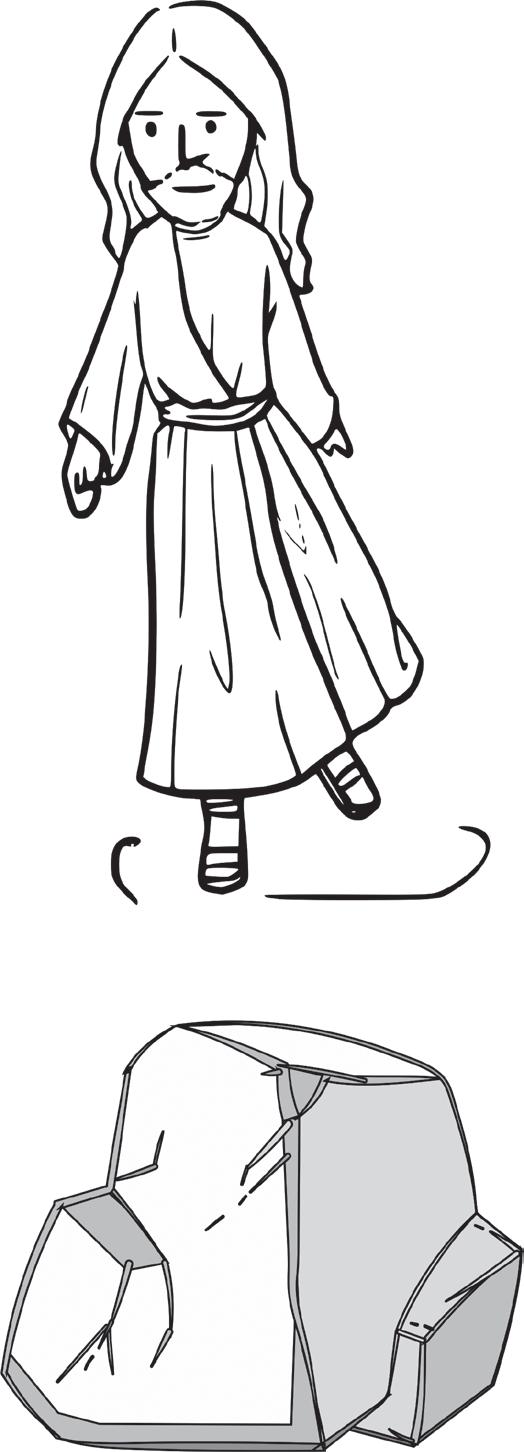 Desenvolvimento da proposta: entregue os desenhos para as crianças e peça para colori-los. Em seguida, recortem o desenho da pedra (que deverá ter, no mínimo, 10 cm de largura, para cobrir o rolinho). O desenho de Jesus pode ficar em formato retangular, mas observe para que fique com, no máximo, 7 cm de altura. Entregue um rolinho para cada criança e peça para que o dobrem.