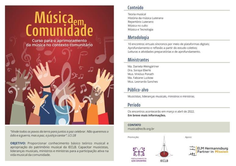 3. Curso Música em Comunidade: a IECLB, com auxílio da Obra Missionária Evangélica Luterana na Baixa Saxônia (OMEL), oferece curso de formação em música. Os encontros acontecerão todas às terças e quintas-feiras dos dias 08 de março até 12 de abril de 2022, às 19h, pela plataforma Zoom. O Link será disponibilizado aos inscritos no dia de cada encontro. As inscrições podem ser feitas pelo seguinte link: https://forms.gle/UkCAm5FWjhnYSprF8