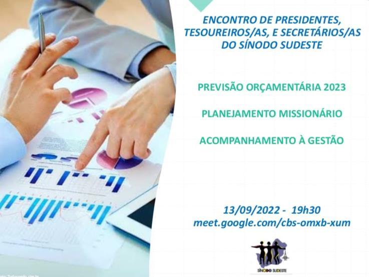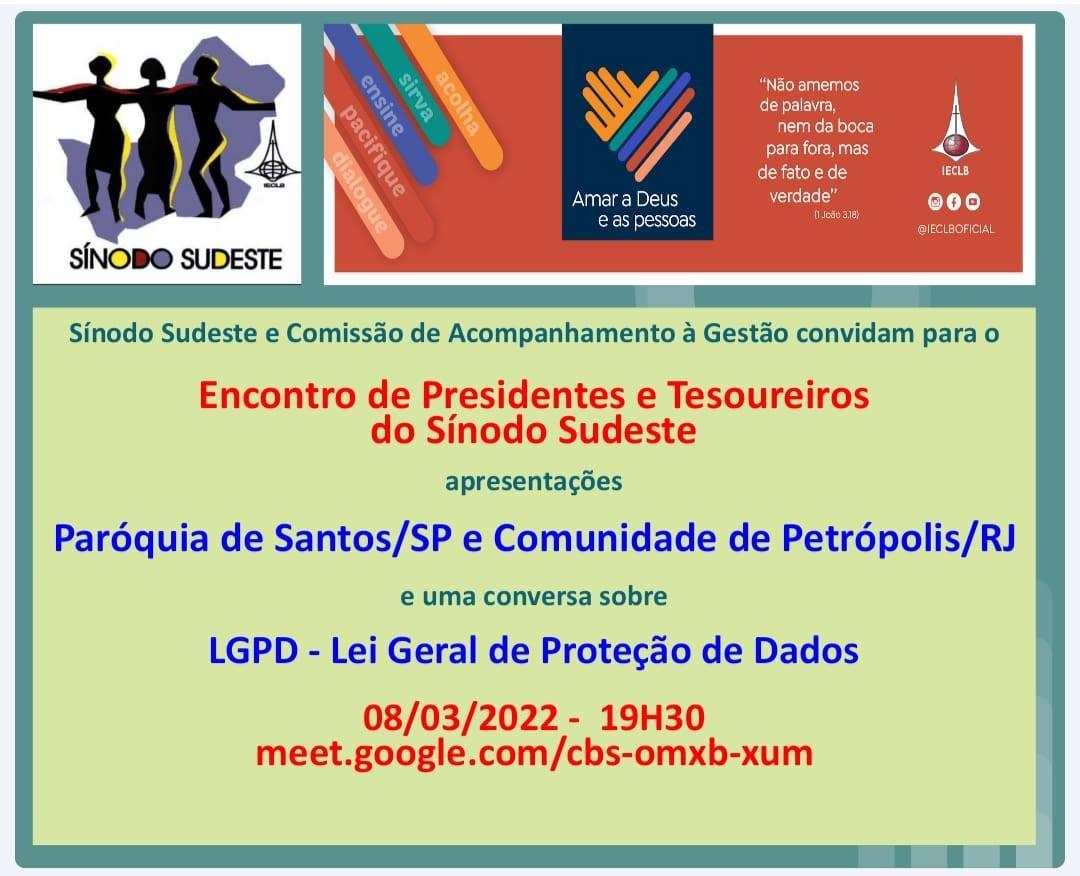 1. Encontro de Lideranças do Sínodo Sudeste: no dia 15/02, 19h30, acontece o primeiro encontro de lideranças do Sínodo Sudeste no ano de 2022. Vamos conversar sobre Coletas (nacionais, sinodais e locais). Por qual motivo a igreja faz coletas? Como são definidos os destinos? ... A assessoria será do P. Olmiro Ribeiro, secretário de Ação Comunitária da IECLB. Participe pelo link: https://meet.google.com/cbs-omxb-xum