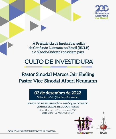 3. Investidura do Pastor Sinodal e Pastor Vice Sinodal: No dia 3 de dezembro foram investidos em suas funções o Pastor Marcos Jair Ebeling e o Pastor Alberi Neumann como Pastor e Pastor Vice Sinodal, respectivamente. Veja como foi no link: https://luteranos.com.br/noticias/sinodo-sudeste-investe-pastor-epastor-vice-sinodal. A prédica proferida na ocasião você lê, de forma resumida, na Palavra Pastoral desta edição.