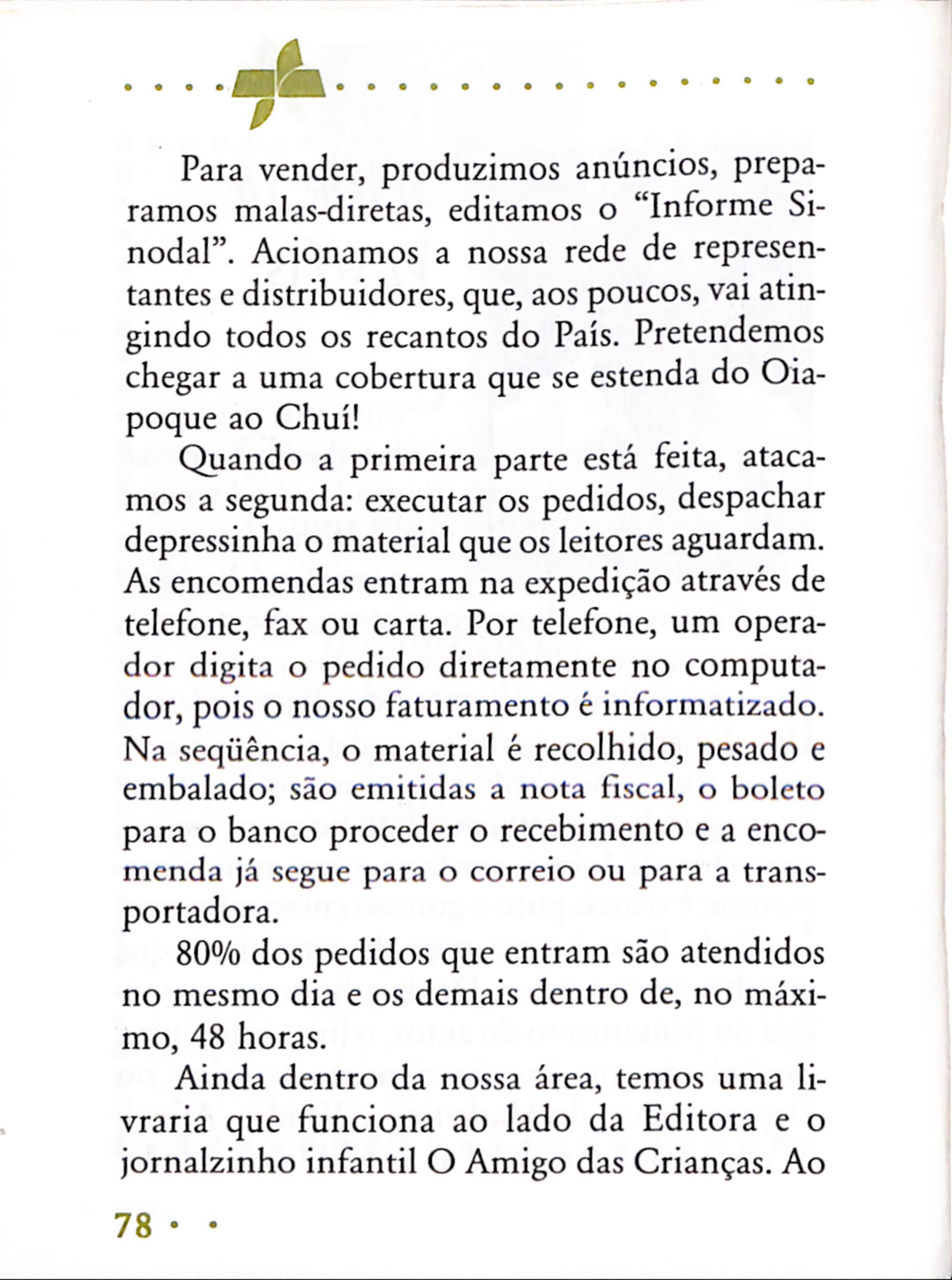 Para vender, produzimos anúncios, prepa ramos malas-diretas, editamos o “Informe Sinodal”. Acionamos a nossa rede de represen tantes e distribuidores, que, aos poucos, vai atin gindo todos os recantos do País. Pretendemos chegar a uma cobertura que se estenda do Oiapoque ao Chuí!