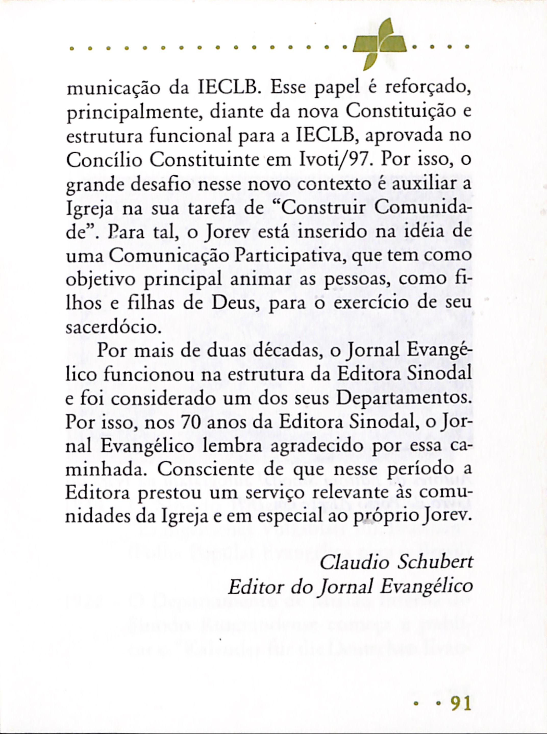 Por mais de duas décadas, o Jornal Evangé lico funcionou na estrutura da Editora Sinodal e foi considerado um dos seus Departamentos. Por isso, nos 70 anos da Editora Sinodal, o Jor nal Evangélico lembra agradecido por essa ca minhada. Consciente de que nesse período a Editora prestou um serviço relevante às comu nidades da Igreja e em especial ao próprio Jorev.