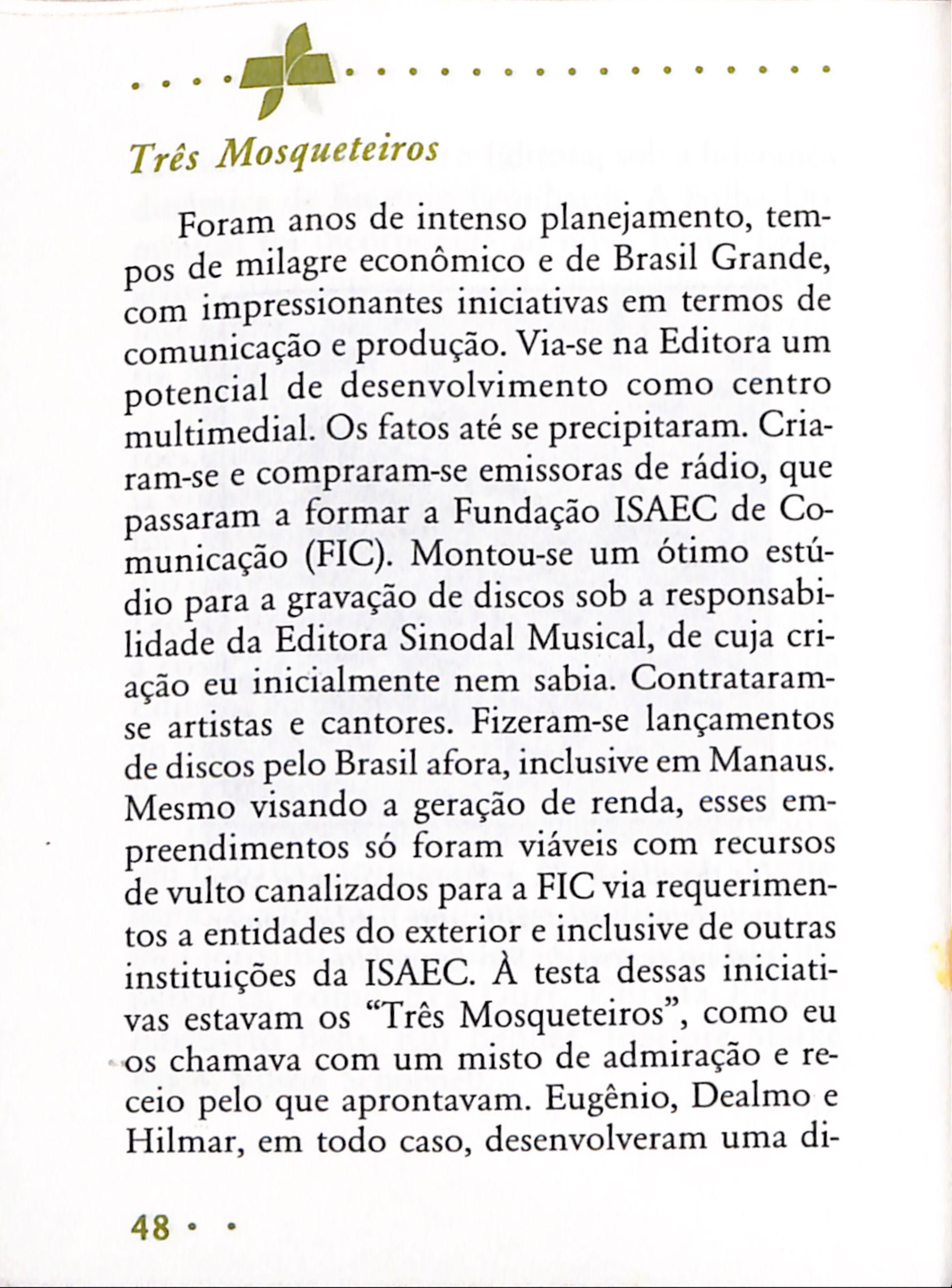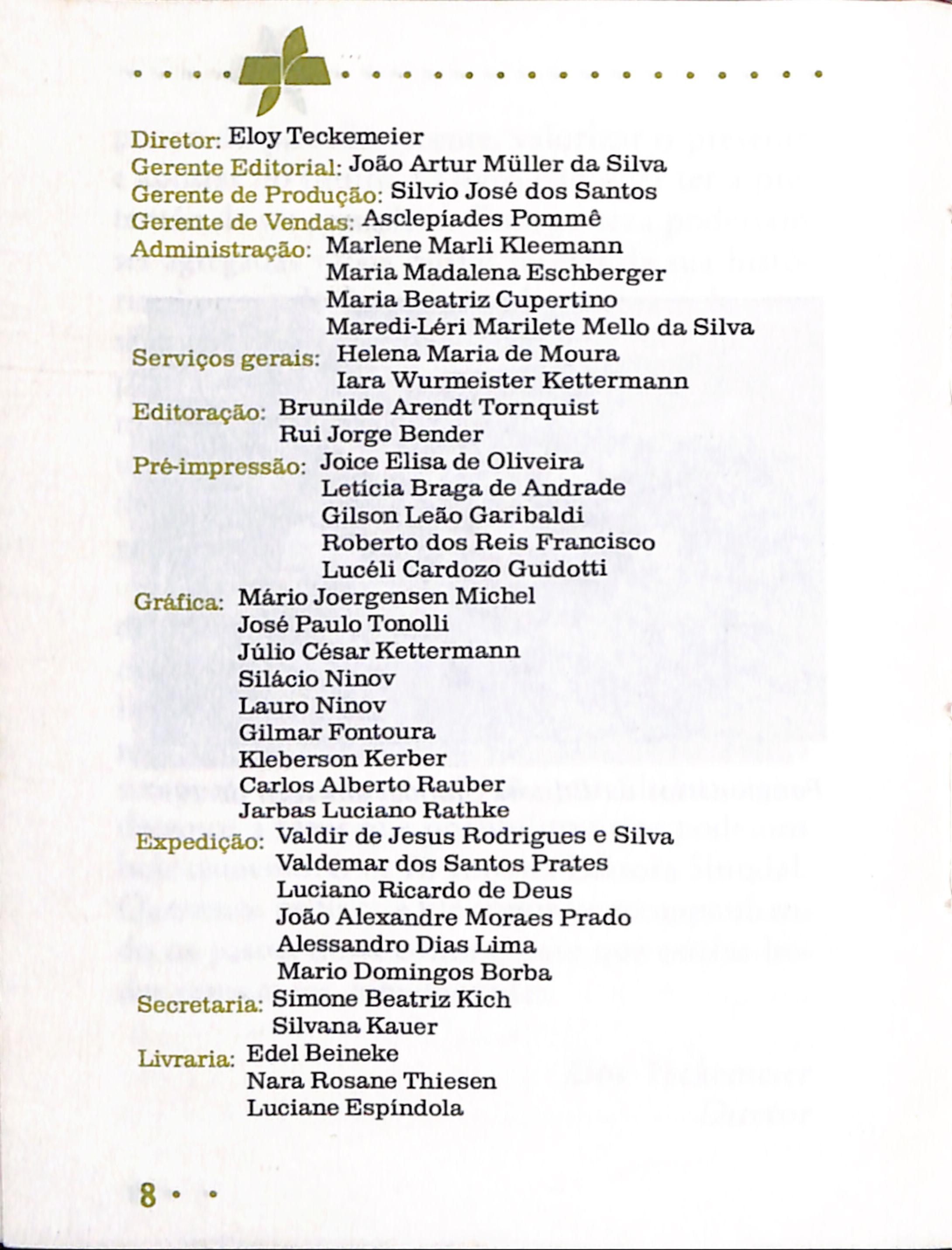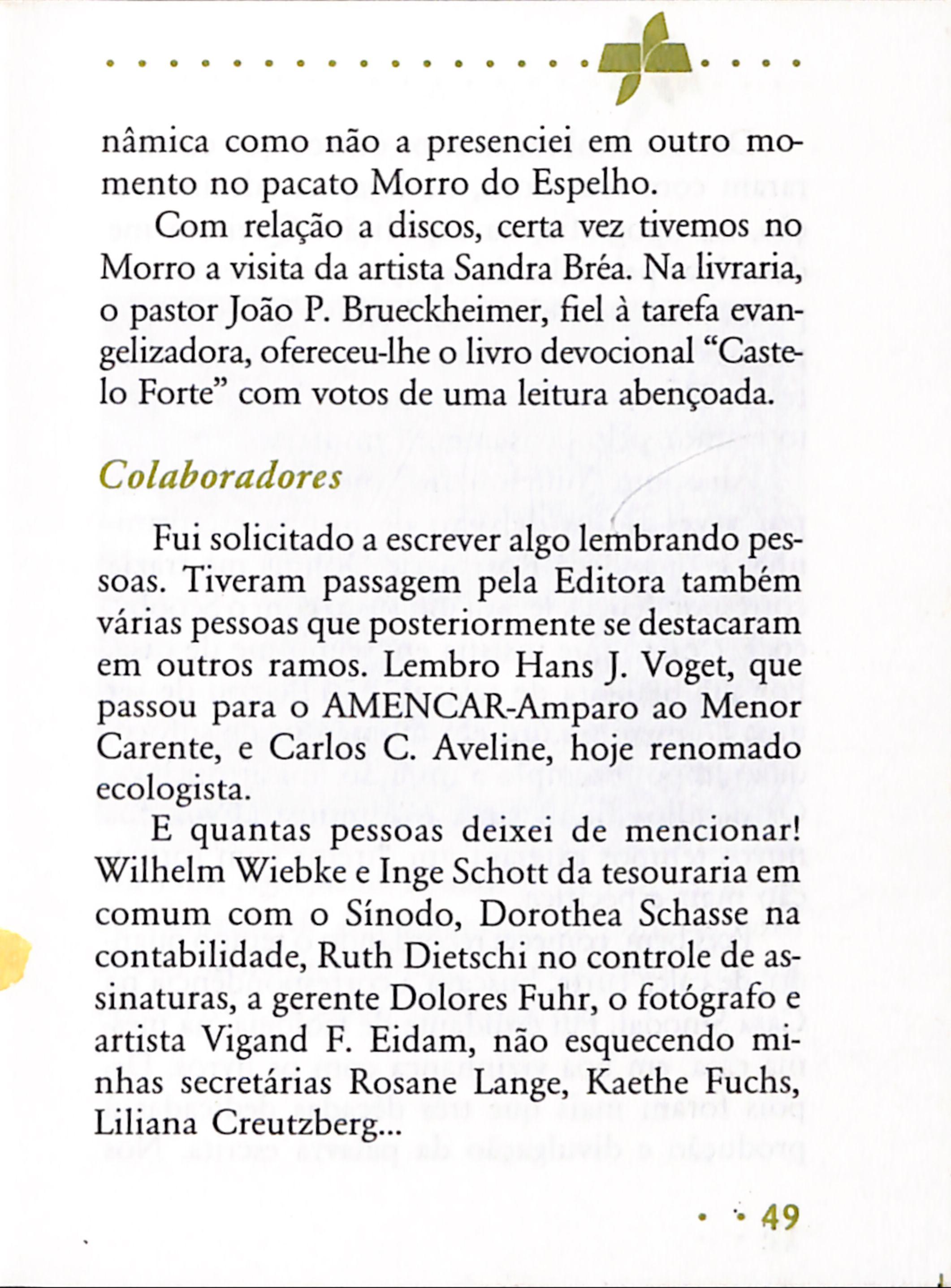 Trabalho na Editora Sinodal desde de 1989. Antes desta data não conhecia a Editora nem o Morro do Espelho. Cheguei aqui apenas porque precisava de um empre go. Hoje continuo aqui, porque gosto do que faço e conto com a amizade dos colegas e um ótimo ambiente de trabalho. Aqui também tenho a oportunidade de conhecer pessoas li gadas a lECLB vindas de várias regiões e até do exterior.