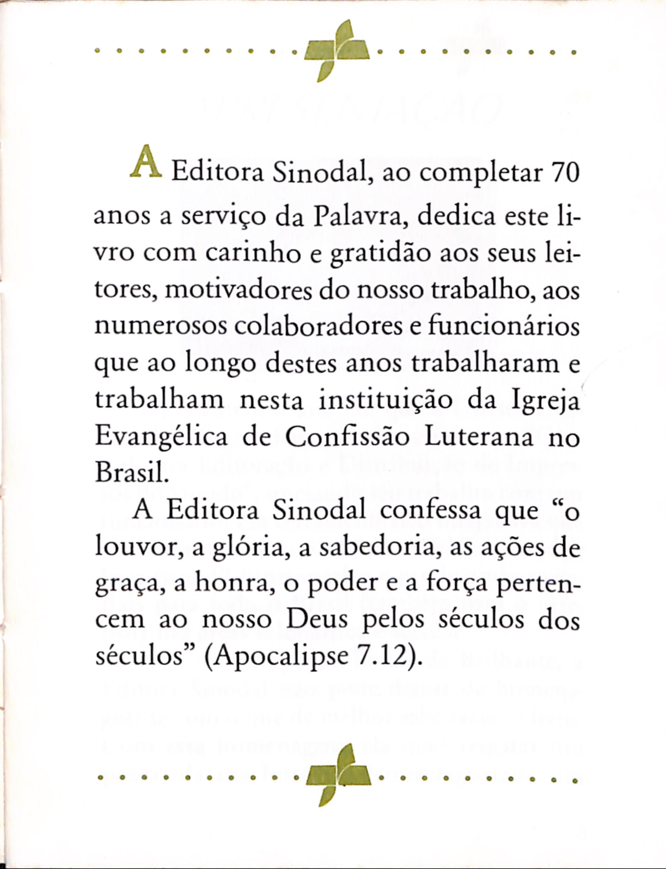 A Editora Sinodal, ao completar 70 anos a serviço da Palavra, dedica este li vro com carinho e gratidão aos seus lei tores, motivadores do nosso trabalho, aos numerosos colaboradores e funcionários que ao longo destes anos trabalharam e trabalham nesta instituição da Igreja Evangélica de Confissão Luterana no Brasil.