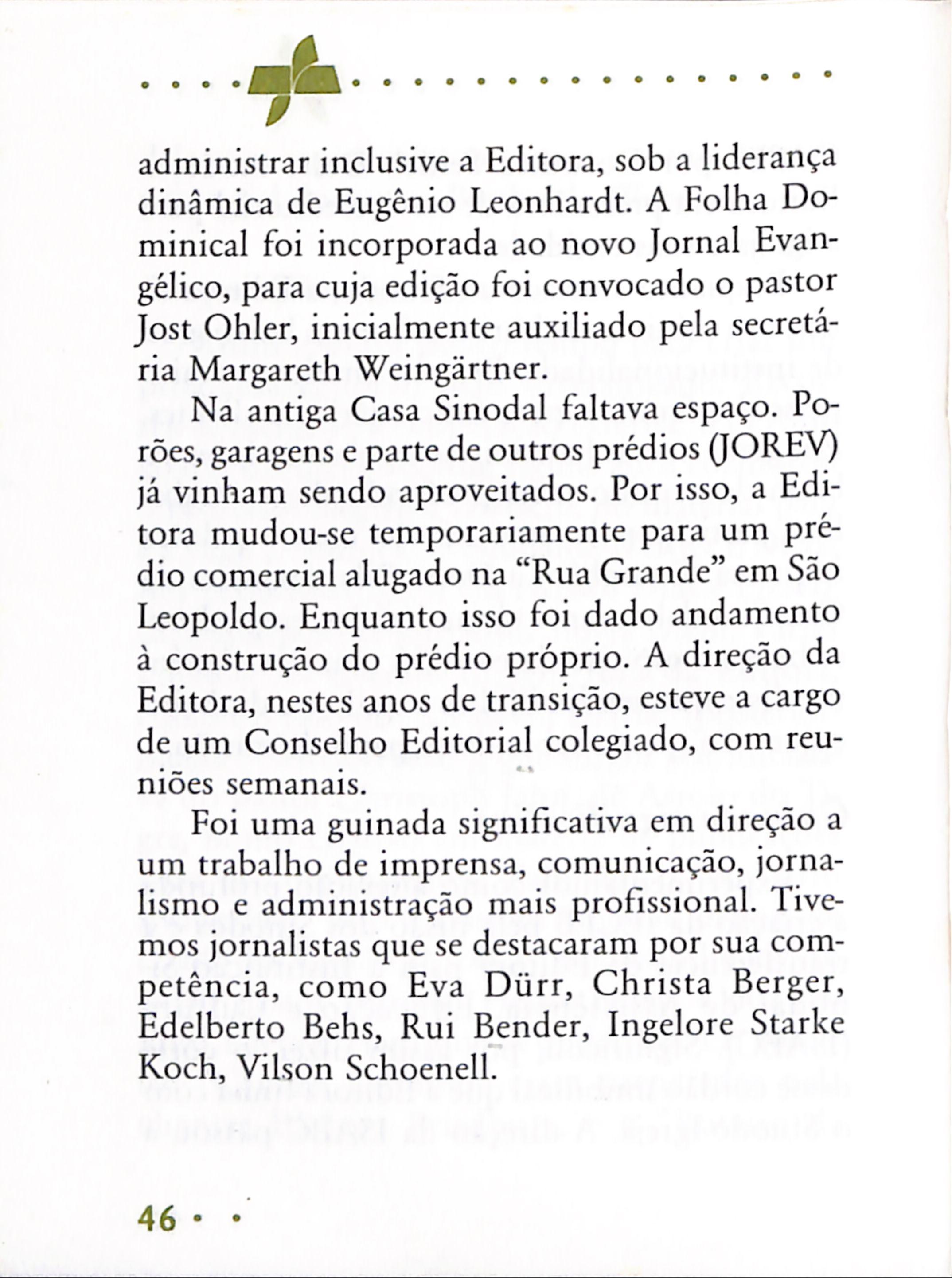 Nós, atuais administradores, “herdeiros” de um patrimônio intelectual e cultural da co municação impressa na lECLB (Igreja Evangé lica de Confissão Luterana no Brasil), quere mos agradecer a todas as pessoas que fizeram a sua parte nessa história. Não por último, agra decemos a Deus que possibilitou que podemos hoje comemorar os 70 anos da Editora Sinodal. Queremos pedir que Ele continue acompanhan do os passos dessa editora, para que outras bo das possam ser comemoradas.