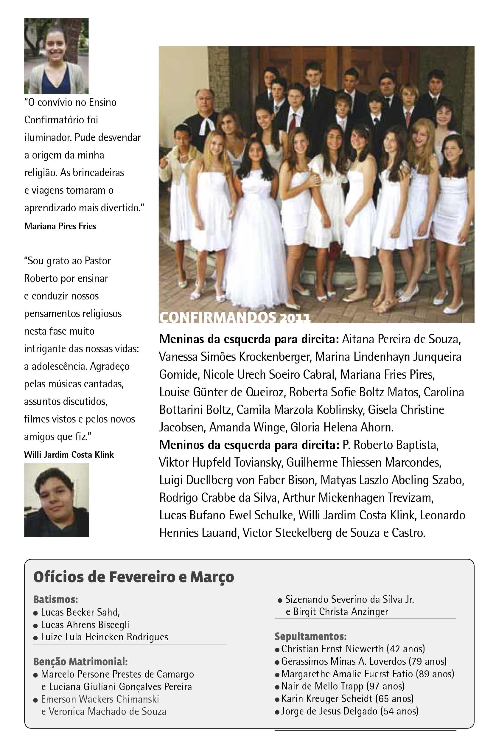 LEMA DO ANO Não deixem que o mal vença vocês, mas vençam o mal com o bem. Romanos 12,21 Batismos: • Bianca Franz Boldt • Natalia Franz Boldt • Sofia Fagundes Caccavale • Leticia de Lima Schwarzbach • Bernardo Rafael Nestlehner Graetz • Luana Pimenta Möbus • Lara Pimenta Möbus • Melissa Alves Escudeiro • Arthur Moraes Cimino Negrão • Anaïs Lien Buser • Aila Liv Buser Benção Matrimonial: • Fabio Carvalho dos Santos e Samantha Lourenço Tome Sepultamentos: • Rudolf Richard Eberhard Theuer (82 anos) • Celso Ernani Hemb Filho (53 anos) • Luize Küster Jaschke (90 anos) • Maria Emilia da Cunha Amélia Renda (95 anos) • Friedrich Loeben (88 anos) Ofícios de Novembro/ Dezembro 2010 P. Hermann 9166-1924 P. Roberto 8300-5344 P. Jörn 5184-0618 Telefones dos Pastores