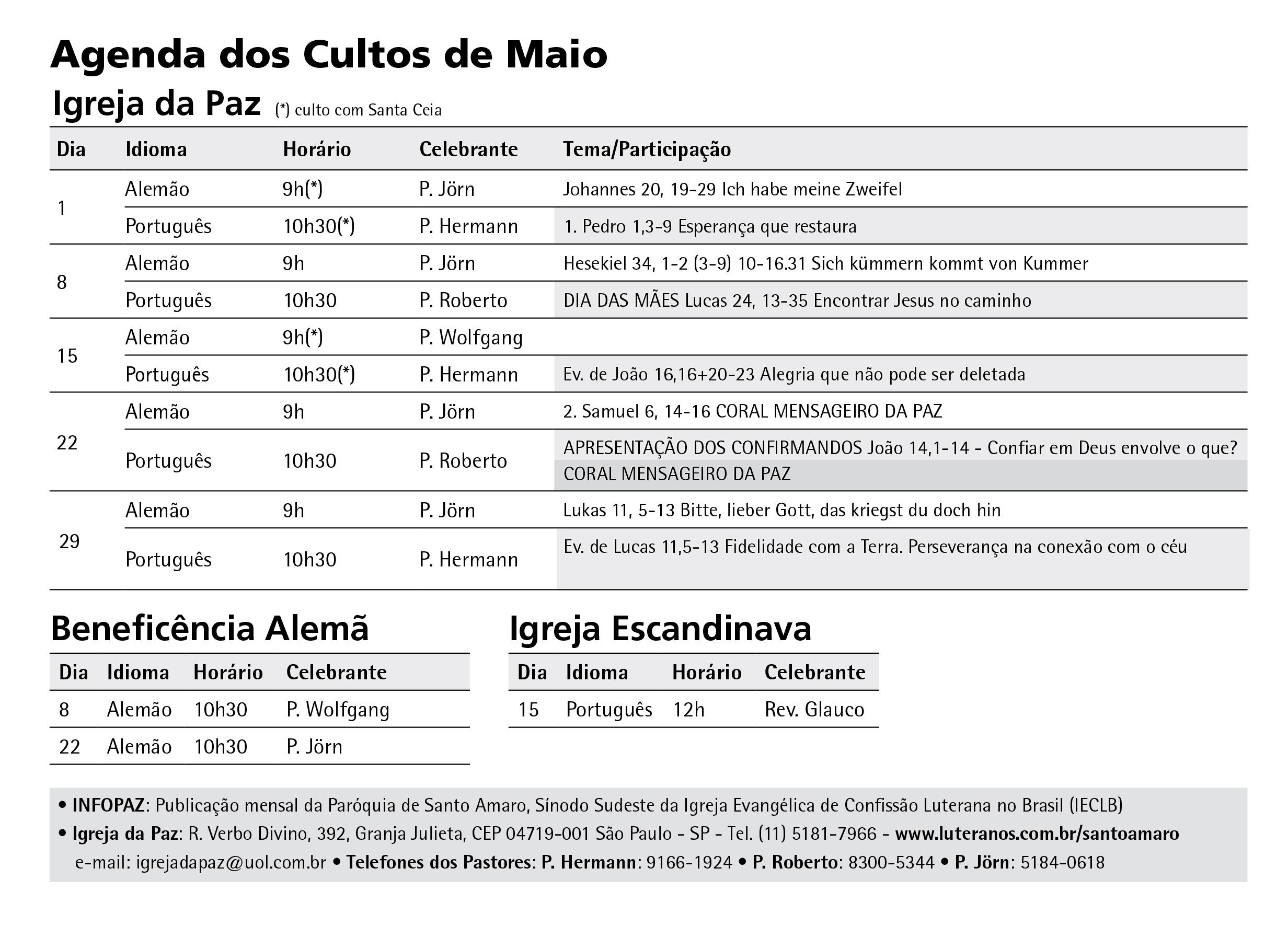 Dia Idioma Horário Celebrante 20 Português 12h Rev. Glauco • INFOPAZ: Publicação mensal da Paróquia de Santo Amaro, Sínodo Sudeste da Igreja Evangélica de Confissão Luterana no Brasil (IECLB) • Igreja da Paz: R. Verbo Divino, 392, Granja Julieta, CEP 04719-001 São Paulo - SP - Tel. (11) 5181-7966 - www.luteranos.com.br/santoamaro e-mail: igrejadapaz@uol.com.br • Telefones dos Pastores: P. Hermann: 9166-1924 • P. Roberto: 8300-5344 • P. Jörn: 5184-0618