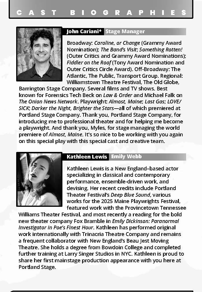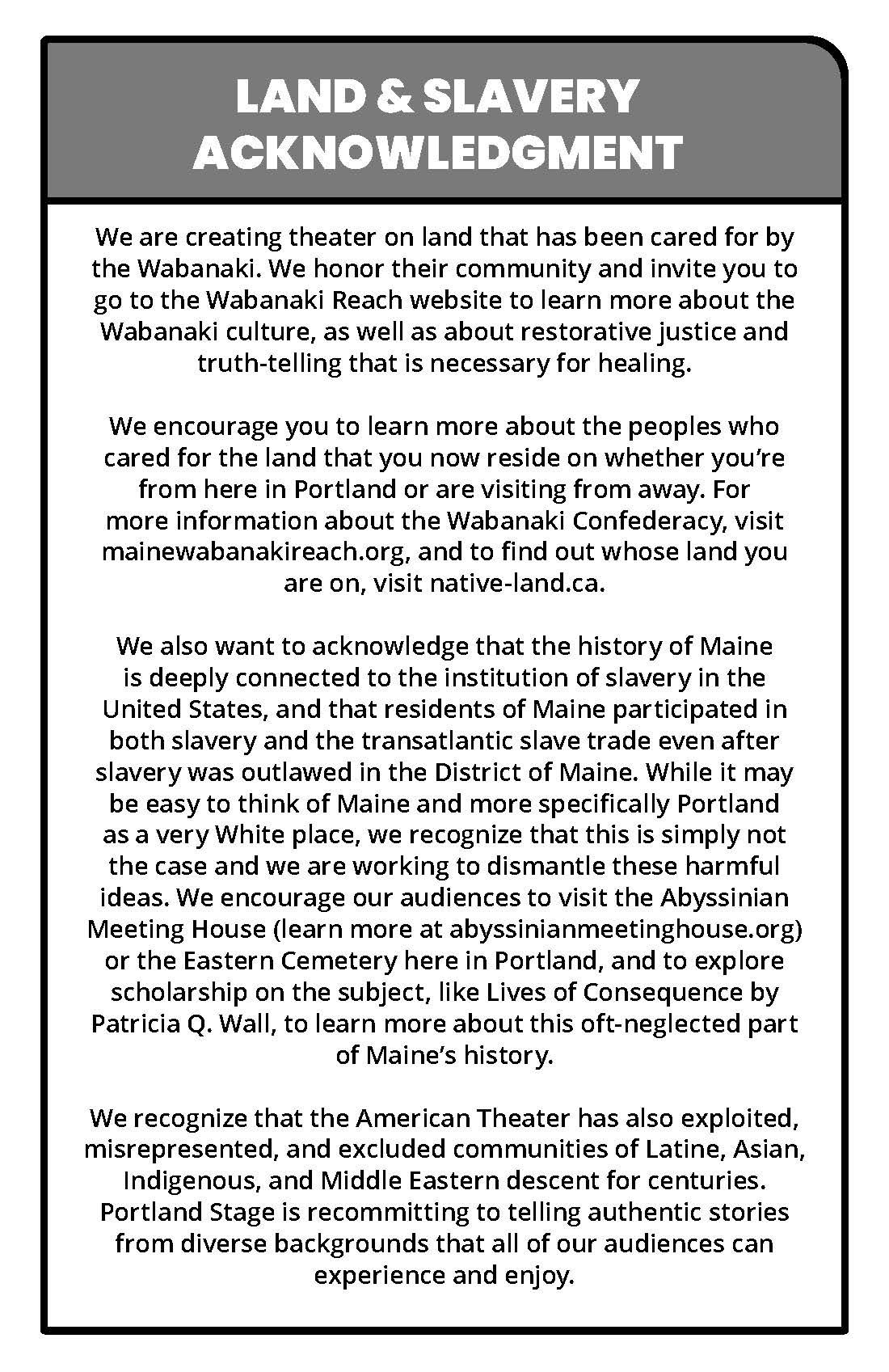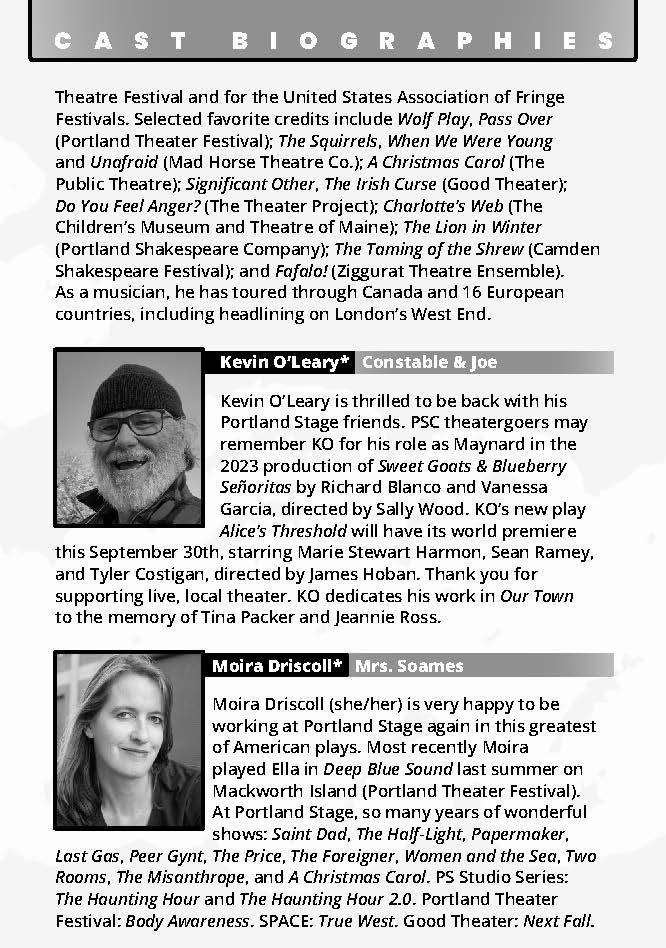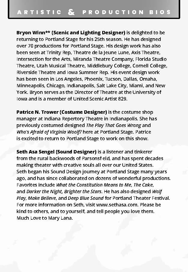 after the second Sunday Matinee of each production for a discussion with the cast of each show, moderated by Literary Manager Todd Brian Backus. These discussions are always free and open to the public, and attendees can join even if they didn’t attend the matinee itself. Check in with the Box Office for runtimes and try to arrive at Portland Stage about five minutes before curtain to join the audience after bows.