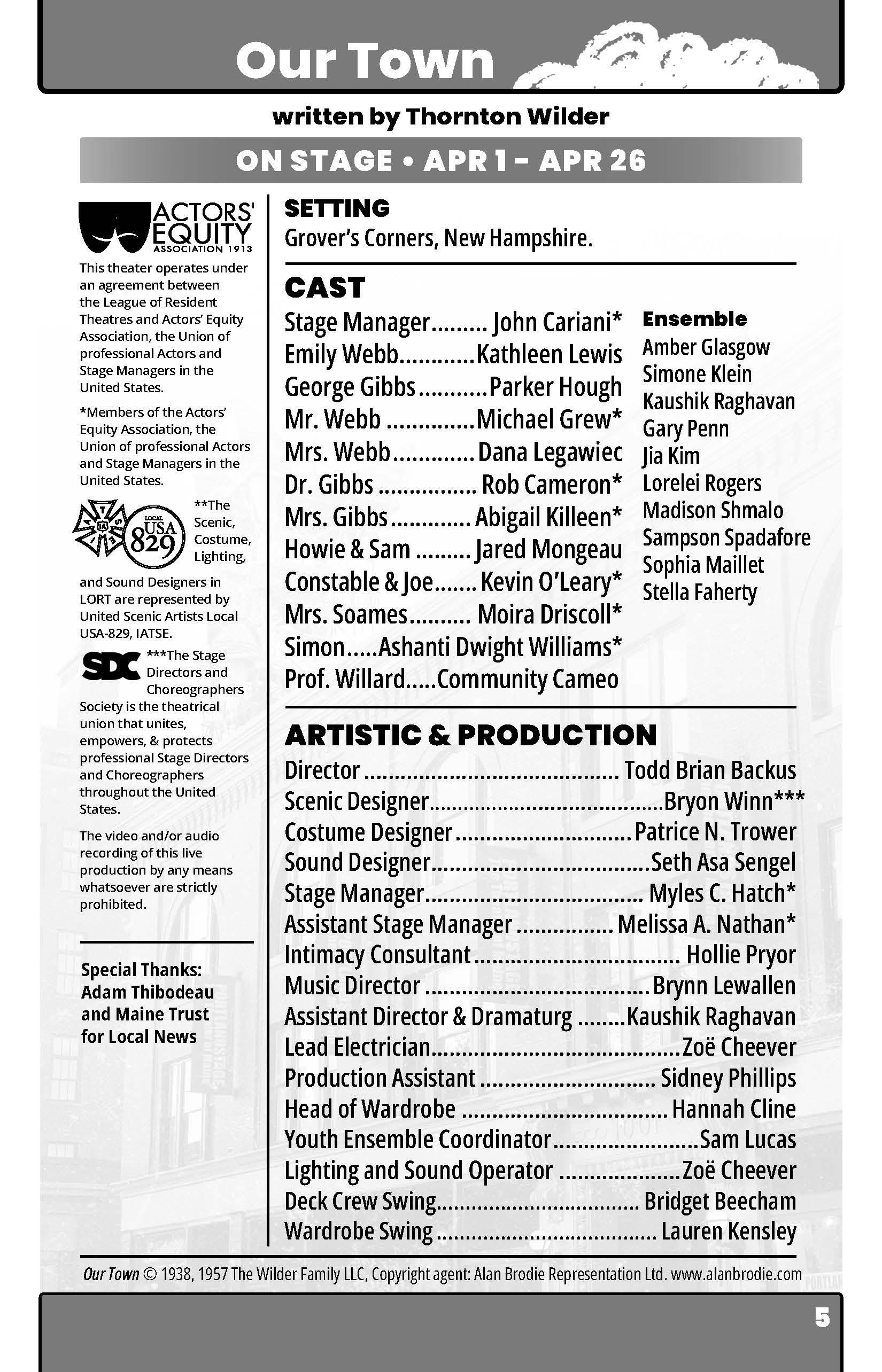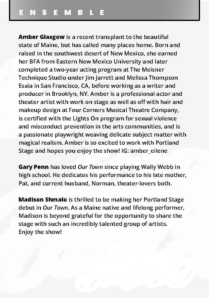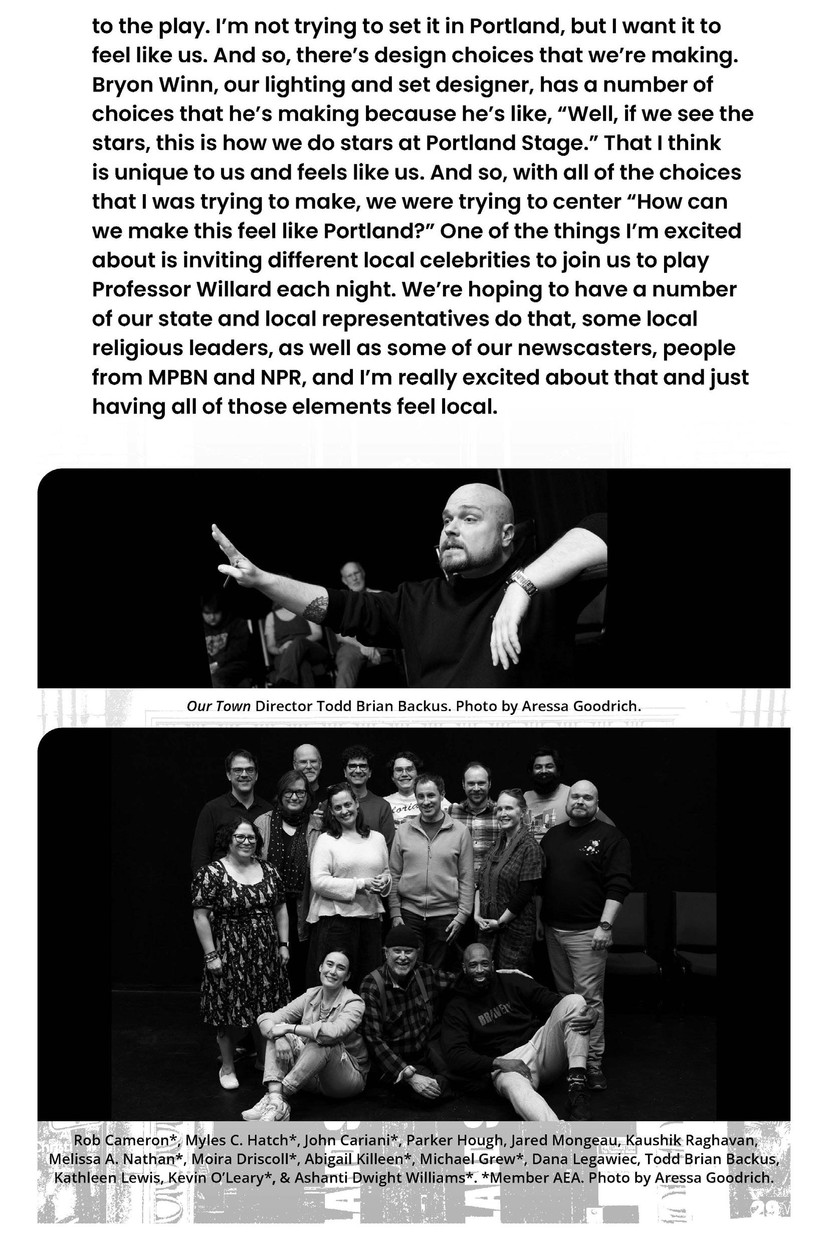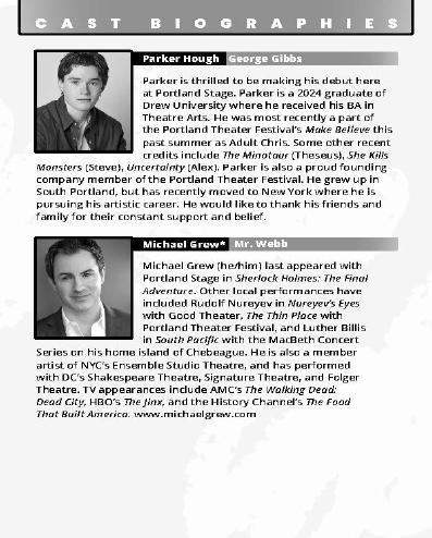 after the second Sunday Matinee of each production for a discussion with the cast of each show, moderated by Literary Manager Todd Brian Backus. These discussions are always free and open to the public, and attendees can join even if they didn’t attend the matinee itself. Check in with the Box Office for runtimes and try to arrive at Portland Stage about five minutes before curtain to join the audience after bows.