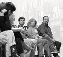 Pictured: Lizz Mangan, Hannah Cordes, Sam Rosentrater*, John Cariani*, Kathy McCafferty*, & Raymond McAnally* during Almost, Maine discussion (2020) (* Member AEA).
